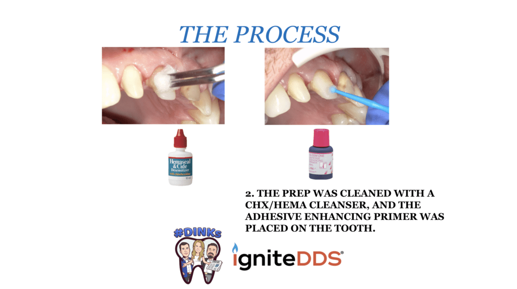 2. The prep was cleaned with a CHX/HEMA cleanser, and the adhesive-enhancing primer was placed on the tooth.